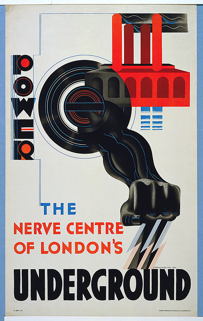 As the century progressed, Pick became more adventurous in his choices for poster designers. As the public became accustomed to traveling underground, new posters were commissioned to advertise not only the Underground’s accessibility, but its modernity. This 1930 poster, Power—The Nerve Center of London’s Underground, designed by the esteemed E. McKnight Kauffer, is a one such example. Taking cues from other Modernist graphic designers, Kauffer communicates the speed and might of London’s Underground with bold, modern typefaces and dynamic illustrations.